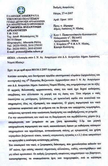 Προς Υπουργείο Πολιτισμού,εφορία βυζαντινών αρχαιοτήτων Αχαΐας.