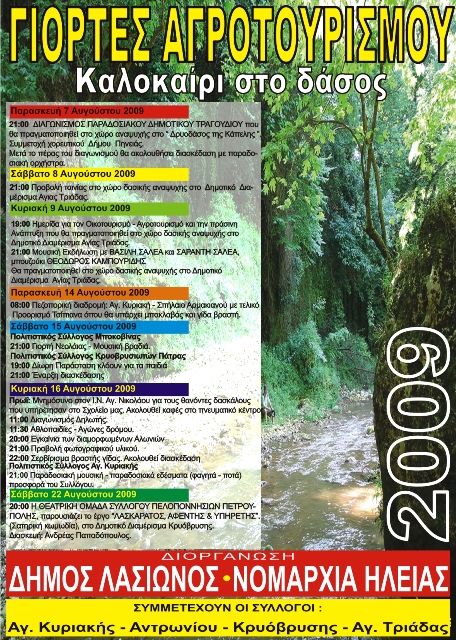 Το Σάββατο, 8 Αυγούστου 2009, στις 19.00, στο Δρυοδάσος Φολόης, στον οικισμό Αγίας Τριάδας Πανόπουλου, Δήμου Λασιώνας οργανώνεται ημερίδα με θέμα «ΟΙΚΟτουρισμός, ΑΓΡΟτουρισμός & ΠΡΑΣΙΝΗ Ανάπτυξη», από τον Δήμο Λασιώνας, σε συνεργασία με την Ένωση Νέων Αγροτών Ηλείας και την Μη Κυβερνητική Οργάνωση ΕΡΥΜΑΝΘΟΣ.