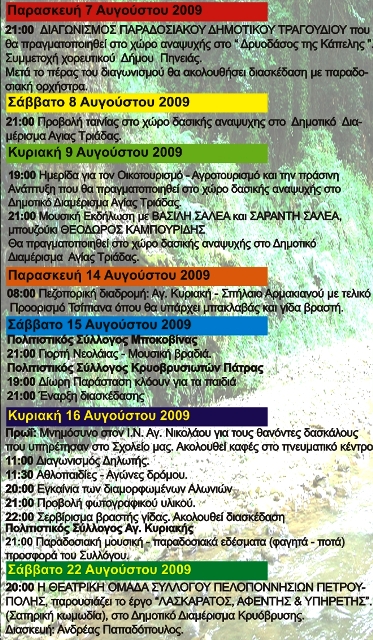 19:00 Ημερίδα για τον Οικοτουρισμο-Αγροτουρισμό και την πράσινη ανάπτυξη που θα πραγματοποιηθεί στο χώρο δασικής αναψυχής στο δημοτικό διαμέρισμα Αγίας Τριάδας.