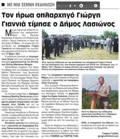 Με μια σεμνή και απέριττη εκδήλωση στο δ.δ. Αντρωνίου στη Σπαρτουλιά, τίμησε ο δήμος Λασιώνος το πρωί της Δευτέρας 24 Μαΐου 2010, τον αγώνα και την αυτοθυσία του οπλαρχηγού Γιώργη Γιαννιά και των παλικαριών του, που έπεσαν μαχόμενα στα Στενά του  Κατσαρού, στις 17 Μαΐου 1821.