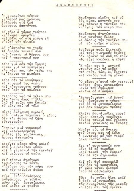 Ποίημα που έγραψε ο Χαράλαμπος Παπαδητρόπουλος (Λάμπης του Κουρατζή) ύστερα από το χαμό της συντρόφου του Νικολίτσας.