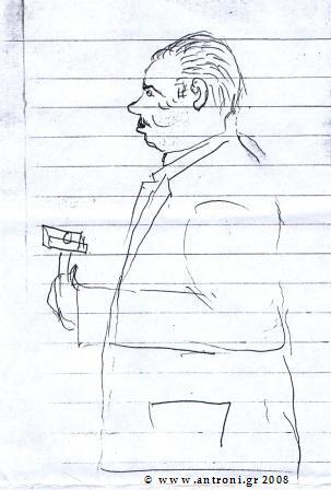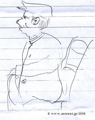 Όταν ήμουν μικρός τον θυμάμαι στα καφενεία να πιάνει το μολύβι και να σχεδιάζει στη λαδόκολλα ή σε χαρτιά που έβρισκε στο τραπέζι, τα σκίτσα ζωντανών και πεθαμένων χωριανών μας. Τα σκίτσα που διασκέδαζαν τους θαμώνες έμεναν στο τραπέζι του καφενείο για πολλές μέρες. Ένα τέτοιο χαρτί είχε κρατήσει ο συντοπίτης φίλος, Θανάσης Τόλιος από τη Θεσσαλονίκη, που ευγενικά μου παραχώρησε να σας παρουσιάσω.