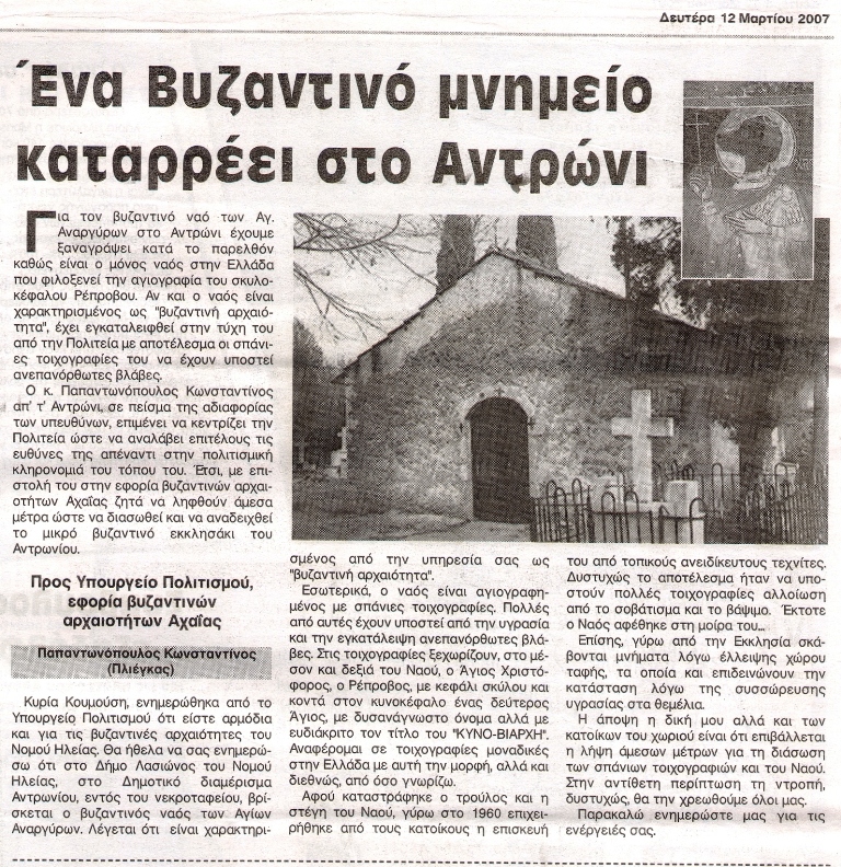 Αν και επισήμως από την πλευρά του δήμου δεν έχει γίνει κάποια ενέργεια, ο νέος δήμαρχος κ. Βασίλης Παπαντώνης έχει έρθει σε επαφή με τις αρμόδιες υπηρεσίες και έχει θέσει το θέμα. Παρ' όλα αυτά έγινε και μία κίνηση από τον κ. Κωνσταντίνο Παπαντωνόπουλο, που κατάγεται από το Αντρώνι και διαμένει στην Αθήνα και ο οποίος ασχολείται με τα μνημεία του δήμου. Ο κ. Παπαντωνόπουλος απέστειλε σχετικό έγγραφο στην Εφορεία Βυζαντινών Μνημείων στην Πάτρα, όπου εκθέτει το πρόβλημα και ζητά να δοθεί άμεσα λύση. Ο ναός βρίσκεται εντός του νεκροταφείου Αντρωνίου και εσωτερικά είναι αγιογραφημένος με σπάνιες τοιχογραφίες. Πολλές από αυτές έχουν υποστεί ανεπανόρθωτες βλάβες από την υγρασία και την εγκατάλειψη. Στις τοιχογραφίες, μεταξύ άλλων, ξεχωρίζουν στο μέσον του ναού, ο Άγιος Χριστόφορος ο Ρέπροβος, με κεφάλι σκύλου και κοντά στον κυνοκέφαλο ένας δεύτερος Άγιος, με δυσανάγνωστο όνομα, αλλά με ευδιάκριτο τον τίτλο του «ΚΥΝΟ-ΒΙΑΡΧΗ». Πρόκειται για τοιχογραφίες μοναδικές στη χώρα και ενδεχομένως σε ολόκληρο τον κόσμο και απαιτούν συντήρηση για να μπορέσουν να διασωθούν.