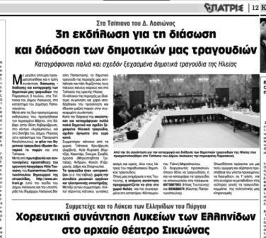Με μεγάλη επιτυχία πραγματοποιήθηκε και η τρίτη συνάντηση διάσωσης διάδοσης και καταγραφής των δημοτικών μας τραγουδιών, την Παρασκευή 3-7-09, στο χωριό Τσίπιανα του δήμου Λασιώνος, στο κατάστημα του κ. Δημητρίου Παπαναγιώτου. Μετά από τις δυο προηγούμενες εκδηλώσεις που προηγήθηκαν στις 15-2-09 στο Χάβαρι του δήμου Αμαλιάδας στην θέση Χαβαρόβρυση και στο κέντρο «Αγράμπελη», του κ. Πέτρου Χαραλαμπόπουλου και στις 19-3-09, στο χωριό Σκλήβα του δήμου Πηνείας στο κατάστημα του κ. Παναγιώτη Νικολόπουλου, οι φίλοι του δημοτικού τραγουδιού έδωσαν δυναμικά το παρόν και στο χωριό Τσίπιανα.